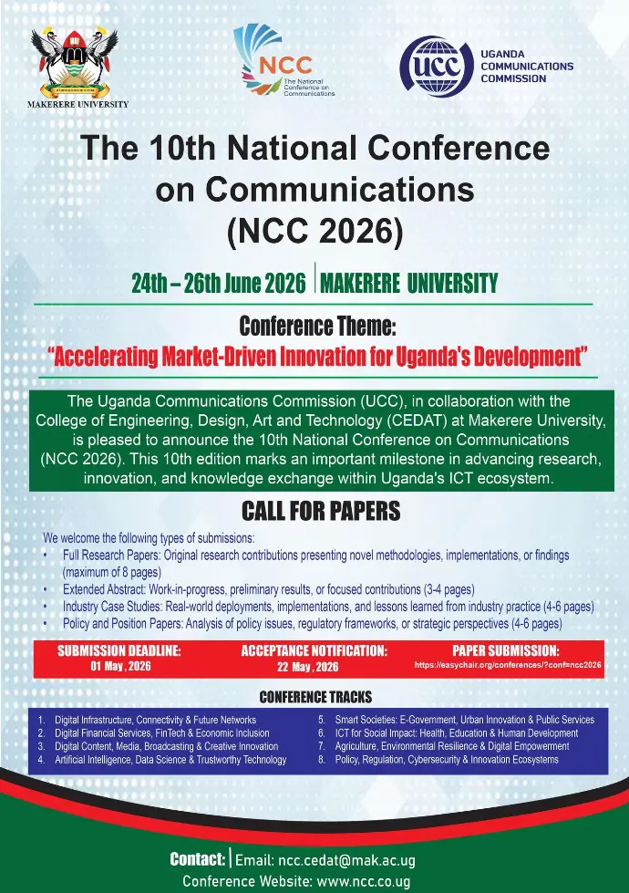 The Uganda Communications Commission (UCC) is pleased to announce the 10th National Conference on Communications (NCC 2026), hosted in collaboration with the Makerere University College of Engineering, Design, Art and Technology (CEDAT) at Makerere University.